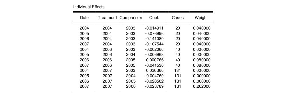 Each of the ATET components in this table is itself a weighted average of individual treatment-year pair comparisons. The second section of the spool displays the individual