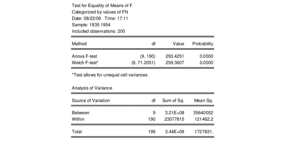 Similarly, you may test equality of means across cross-sections (). Simply open the series, then select . Enter FN in the edit field, and select to continue. EViews will compute and display the results for an ANOVA for F, classifying the data by firm ID. The top portion of the ANOVA results is given by: