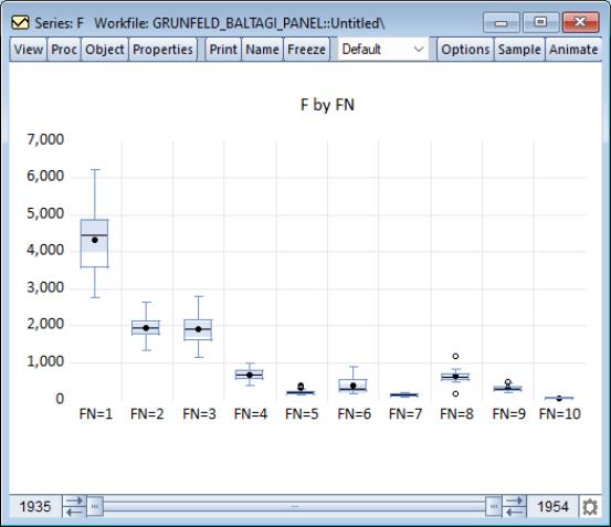 A graphical summary of the primary information in the ANOVA may be obtained by displaying boxplots by cross-section or period. For moderate numbers of distinct classifier values, the graphical display may prove informative. to bring up the Graph Options dialog. Select Categorical graph from the drop down on the top left, select Boxplot from the list of graph types, and enter FN in the edit field. Click to display the boxplots using the default settings.