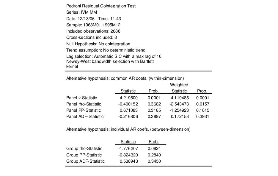 The top portion of the output indicates the type of test, null hypothesis, exogenous variables, and other test options. The next section provides several Pedroni panel cointegration test statistics which evaluate the null against both the homogeneous and the heterogeneous alternatives. In this case, eight of the eleven statistics do not reject the null hypothesis of no cointegration at the conventional size of 0.05.