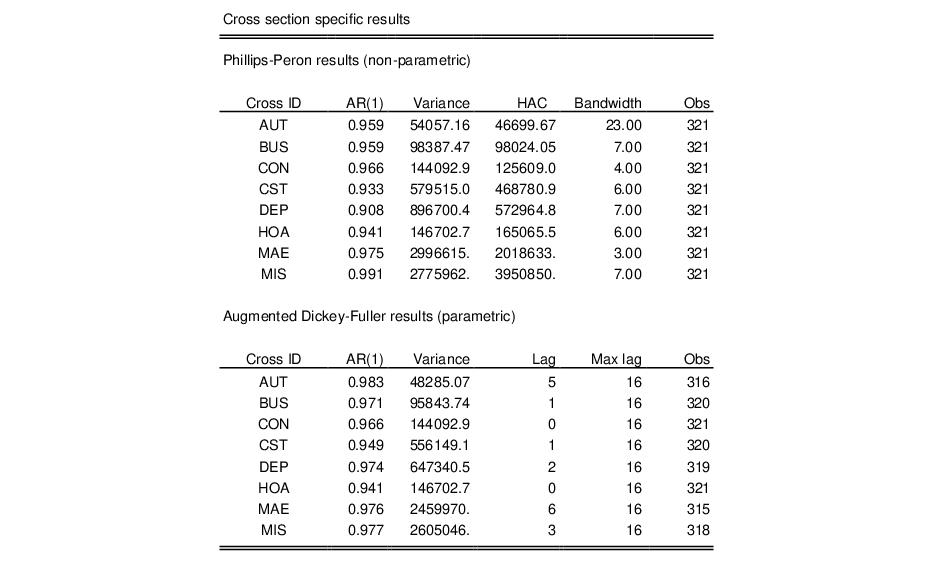 The bottom portion of the table reports auxiliary cross-section results showing intermediate calculating used in forming the statistics. For the Pedroni test this section is split into two sections. The first section contains the Phillips-Perron non-parametric results, and the second section presents the Augmented Dickey-Fuller parametric results.
