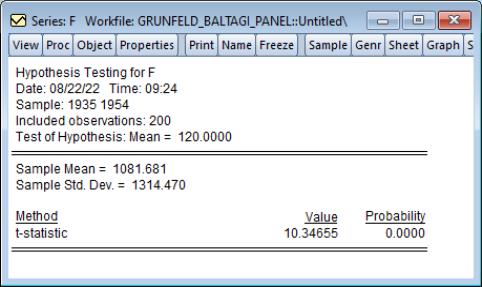 Similarly, suppose you wish to perform a hypothesis testing on a single series. Open the window for the series F, and select . Enter “120” in the edit box for testing the mean value of the stacked series against a null of 120. EViews displays the results of a simple hypothesis test for the mean of the 200 observation stacked data.