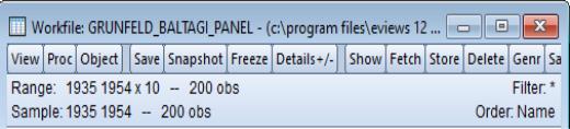 For a dated panel workfile, EViews will list both the earliest and latest observed dates, the number of cross-sections, and the total number of unique observations. Here we see the top portion of an annual workfile with observations from 1935 to 1954 for 10 cross-sections. Note that workfile sample is described using the earliest and latest observed annual frequency dates (“1935 1954”).