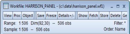 In contrast, an undated panel workfile will display an observation range of 1 to the total number of observations. The panel dimension statement will indicate the largest number of observations in a cross-section and the number of cross-sections. Here, we have 92 cross-sections containing up to 30 observations, for a total of 506 observations. Note that the workfile sample is described using the raw observation numbers (“1 506”) since there is no notion of a date pair in undated panels.