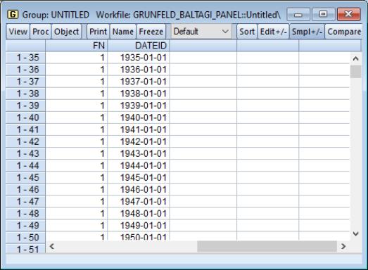 The left-hand side of every workfile contains observation labels that identify each observation. In a simple unstructured workfile, these labels are simply the integers from 1 to the total number of observations in the workfile. For dated, non-panel workfiles, these labels are representations of the unique dates associated with each observation. For example, in an annual workfile ranging from 1935 to 1950, the observation labels are of the form “1935”, “1936”, etc.
