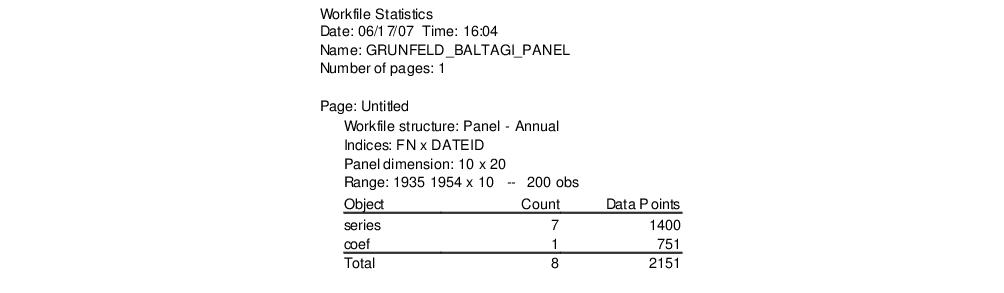 First, the workfile statistics view provides a convenient place for you to examine the structure of your panel workfile. Simply click on from the main menu to display a summary of the structure and contents of your workfile.