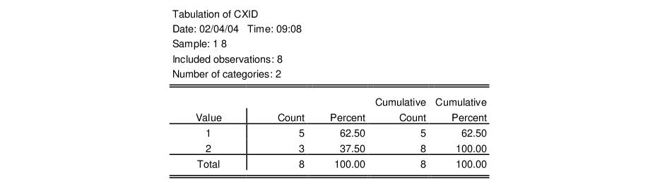 A one-way tabulation of the CXID series shows the number of observations in each cross-section or group: