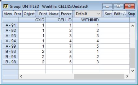 Suppose, for example, we have a panel workfile with two cross-sections. There are 5 observations in the cross-section “A” with cell ID values “1991”, “1992”, “1993”, “1994”, and “1999”, and 3 observations in the cross-section “B” with cell ID values “1993”, “1996”, “1998”. There are 7 unique cell ID values (“1991”, “1992”, “1993”, “1994”, “1996”, “1998”, “1999”) in the workfile.