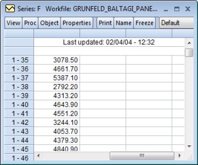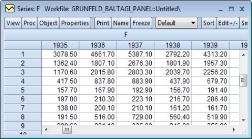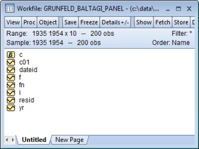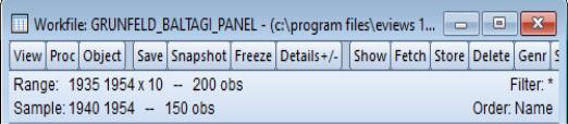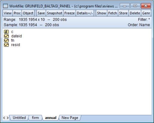 In illustrating these tools, we will work with the familiar Grunfeld data containing data on R&D expenditure and other economic measures for 10 firms for the years 1935 to 1954 (provided in the workfile “Grunfeld_Baltagi_Panel.WF1”). These 200 observations form a balanced annual workfile that is structured using the firm number FN as the cross-section ID series, and the date series DATEID to identify the year.