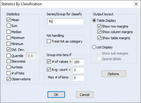 Alternately, to compute statistics for each period in the panel, you should enter “DATEID” instead of “FN” as the classifier series.