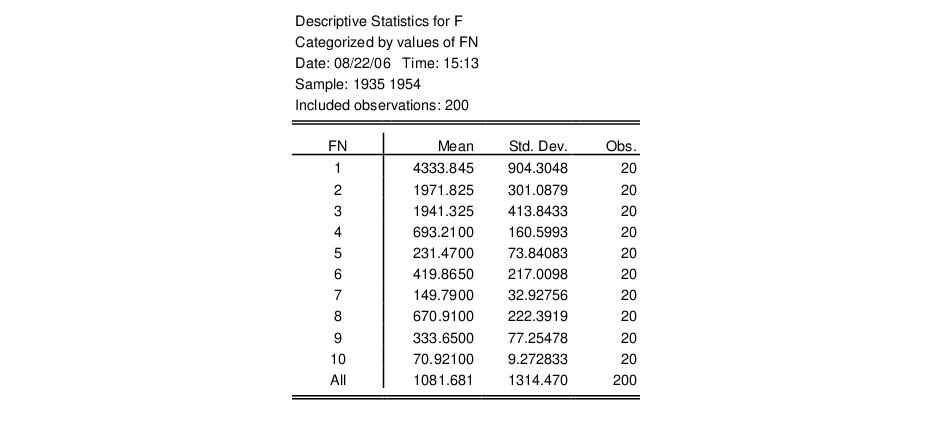 First, you should enter the classifier series in the edit field. Here, we use FN, so that EViews will compute means, standard deviations, and number of observations for each cross-section in the panel workfile. Note that we have unchecked the options so that EViews will not combine periods. The result of this computation for the series F is given by: