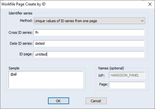 To create a page for the firm data, click on the tab in the workfile window, and select . EViews opens the dialog, with the identifiers pre-filled with the series used in the panel workfile structure—the field contains the name of the series used to identify dates in the panel, while the series field contains the name of the series used to identify firms.