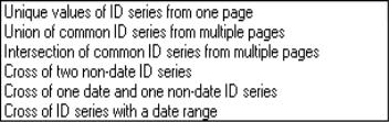 The default is set to, which instructs EViews to simply look at the unique values of the ID series in the specified ID page. Alternately, you may provide multiple pages and take the union or intersection of IDs ( and ). You may also elect to create observations associated with the crosses of values for multiple series; the different choices permit you to treat date and non-date series asymmetrically when forming these categories (, , ). If you select the latter, the dialog will change, prompting you to specify a frequency, start date and end date.
