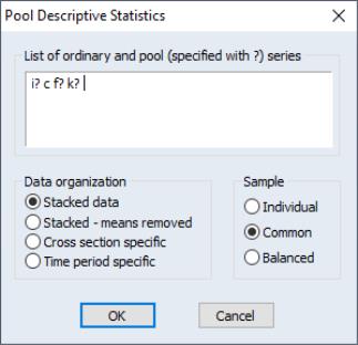• Stacked data: display statistics for each variable in the list, computed over all cross-sections and periods. These are the descriptive statistics that you would get if you ignored the pooled nature of the data, stacked the data, and computed descriptive statistics.