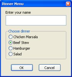 scalar result = @uidialog("Caption", "Dinner Menu", "Edit", name, namePrompt, 64, "Radio", dinner, dinnerPrompt, menu)