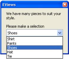 This creates a dialog with a text string and a listbox. The text “We have many pieces to suit your style” appears at the top. A listbox follows, with the label “Please make a selection” and the options: “Shirt”, “Pants”, “Shoes”, “Hat”, and “Tie”. The listbox is initialized to the third item, “Shoes”. If the user then selects the first item, “Shirt”, from the listbox and presses OK, the scalar SELECTION will hold the value 1.