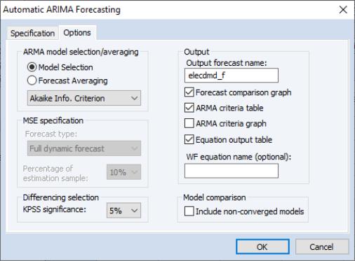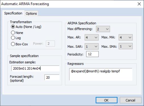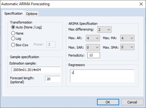To forecast a series automatically using ARIMA models, open up the series and click on which will bring up the Automatic ARIMA Forecasting dialog: