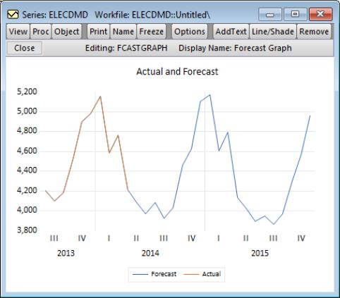 As an example of using automatic ARIMA forecasting in EViews, we forecast monthly electricity demand in England and Wales, using the workfile “elecdmd.wf1”. This workfile contains monthly electricity demand data from April 2005 until April 2014 (in the series ELECDMD), as well as real GDP data for the UK (a good proxy for real GDP in England and Wales) and average monthly temperature (series TEMPF).