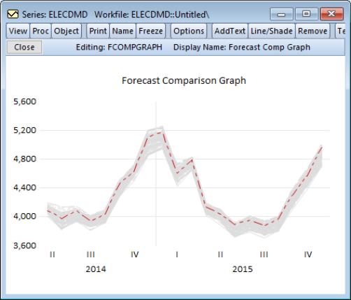 Checking the Forecast comparison graph check box will produce a graph containing the final forecast (either the forecast from the selected model, or the averaged forecast) along side the forecasts from every other ARMA model considered. The final forecast will be colored red, with the other forecasts in grey. Note, the graph is only displayed if the Forecast length specified on the Specification tab is greater than zero (i.e.—a forecast is actually performed).