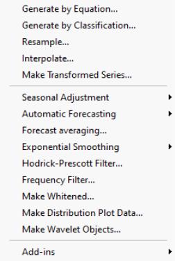 When working with numeric series, you may also use series procs to resample or interpolate from the original series, to perform time series forecasting to perform seasonal adjustment or exponential smoothing, to filter the series using the Hodrick-Prescott or band-pass filters, or to output data used in constructing various distribution graphs such as histograms and kernel density plots, or data from wavelet analysis.
