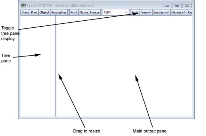 Here we see the spool view of an empty, unnamed spool object. As depicted here, the default is to display the contents of the spool using two panes. The left pane is the tree pane which shows a tree-structure listing of the objects contained in the spool. You may use the tree pane to navigate quickly from object to object. The right pane is the main output pane which shows the actual output view objects.