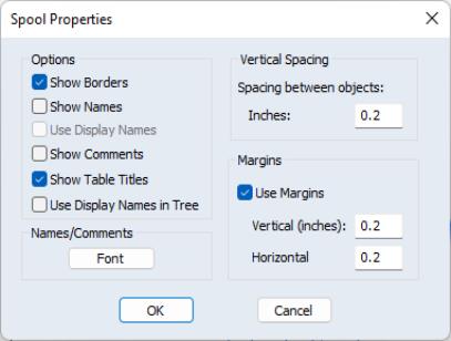 Note that the , and settings may be accessed directly from the spool object toolbar. For example, clicking on the button is the same as checking or unchecking the corresponding box in the dialog.
