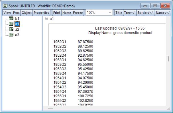 The last option, , requires some discussion. In EViews, table objects have titles which generally differ from the name given the table in the spool. When Show Table Titles is checked (the default), the title of each table will be displayed. If we also turn on Show Names, we see that the object name in the spool is “A1” and the table title is “GDP”: