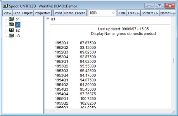 The spool object allows you to display objects at sizes that differ from the native sizes. By separating the display size of the object in the spool from the native object size, EViews permits customizing the display of objects without requiring manual editing of the native size in each output object.