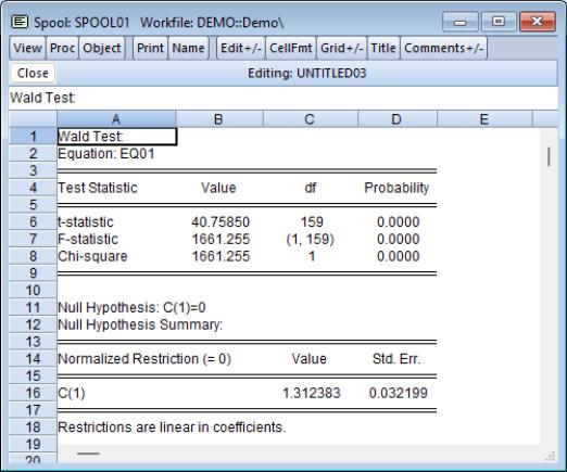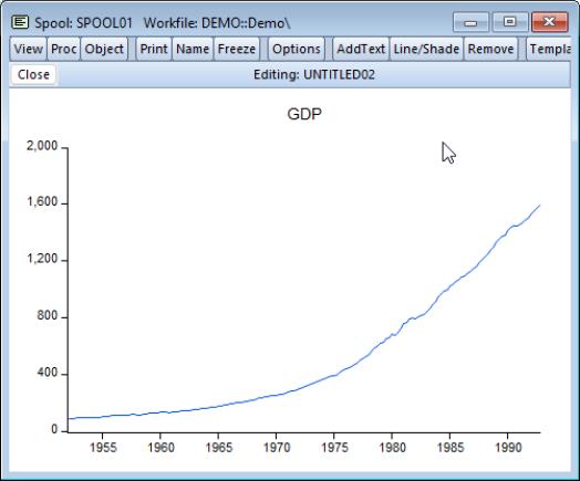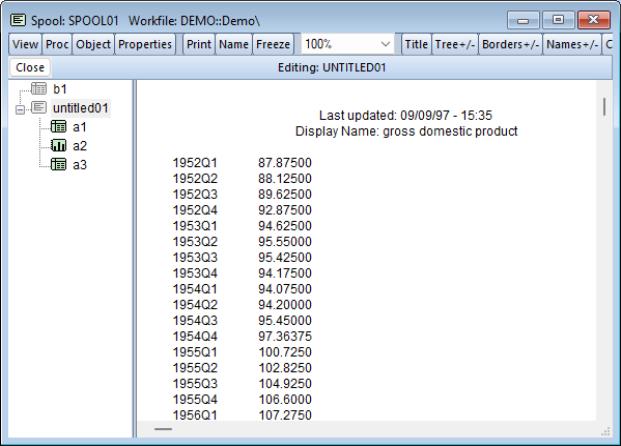 When a spool is placed in edit mode, EViews will display the object being edited using the full width of the window. The toolbar will change to show the options for the edit object, instead of those for the spool object. In addition there be a new region, just below the toolbar, showing the object and display names for the edit object, as well as a button that saves any modifications, turns off edit mode, and returns you to the standard spool window.