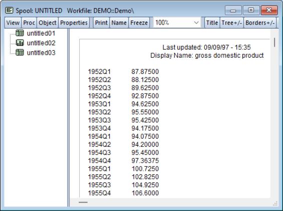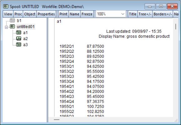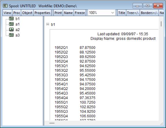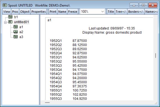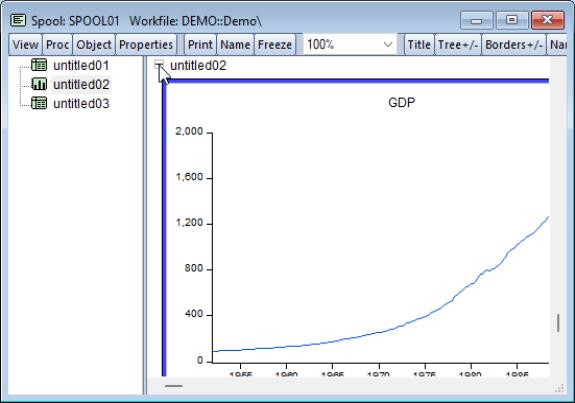 You may copy, or extract, an object in a spool into the workfile. To extract an object, simply highlight the object, and then select from the right mouse-button menu, or click on . EViews will create an untitled output object in the workfile containing a copy of the object in the spool.