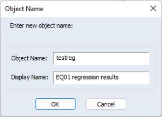 Simply enter a new, valid EViews name in the field, and if desired a display name in the optional field. The display name allows you to provide a more descriptive label that may be employed in place of the object name in the tree pane view when displaying object names.