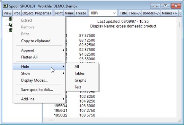 Most of your time using a spool will be spent managing the output objects contained in the spool. EViews provides easy-to-use tools for the all of the basics tasks like adding, deleting, extracting, and rearranging objects, as well as more advanced operations such as hiding objects and flattening portions of the tree.