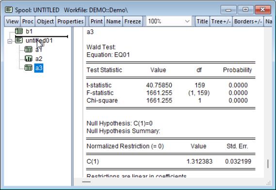 In our example, we select the spool object UNTITLED02, and use the right mouse-button to select . EViews will replace UNTITLED02 with all of its child output objects, renaming the objects as necessary to avoid name conflict.