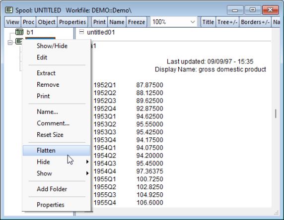 Select the name of the embedded spool you wish to flatten in the tree pane, then click on or press the right mouse-button and select . EViews will replace the spool with all of the output objects in the spool.