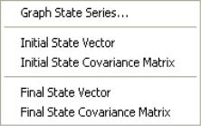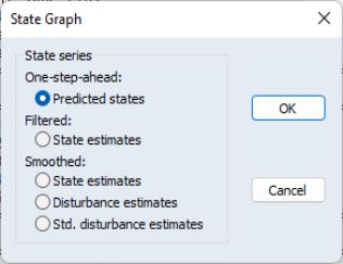 To examine the unobserved state components, click on to display the state submenu. EViews allows you to examine the initial or final values of the state components, or to graph the full time-path of various filtered or smoothed state data.