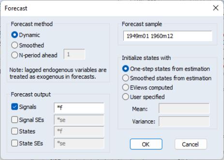 • The dialog allows you to generate forecasts of the states, signals, and the associated standard errors using alternative methods and initialization approaches.