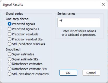 • allows you to create series containing various signal results computed over the estimation sample. Simply click on the menu entry to display the results dialog.