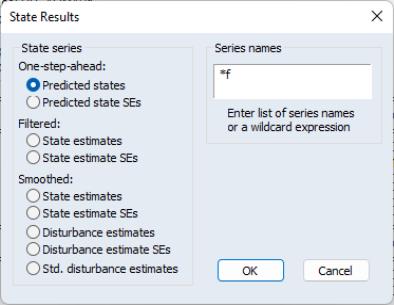 • opens a dialog allowing you to create series containing results for the state variables computed over the estimation sample. You can choose to save either the one-step ahead state estimate,