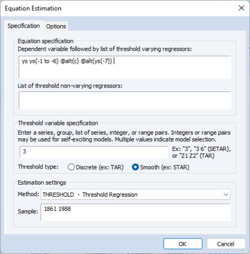 Estimation of a STR model is performed using the same dialog as discrete Threshold Regression. Open an existing equation or select from the main EViews menu, select from the main dropdown menu near the bottom of the dialog, and click on the radio button in the setting.