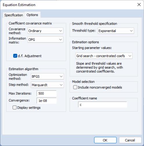 The default method is , in which the regression coefficients are concentrated out of the likelihood and grid search is performed over the transition parameters. Alternately, you may choose which is analogous to the first method, but sets the regression coefficients to zero, which uses OLS regression on the linear portion of the specification, sets the nonlinear coefficient values to zero, and uses data moments to obtain starting values for the slope and threshold, or . The latter will use the coefficients in the coefficient vector specified in the edit field.
