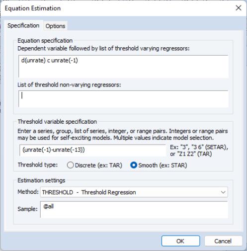 To estimate this model, open the smooth threshold dialog and fill it out as depicted: