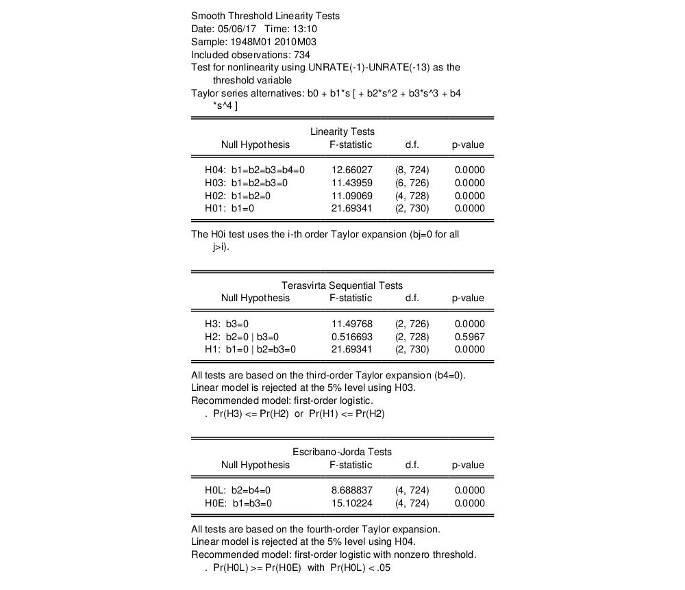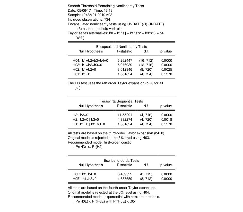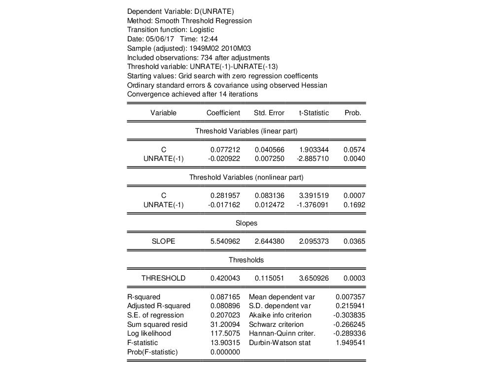 We consider here an example of LSTAR estimation using a multiple equilibrium model of unemployment and data described in Martin, Hurn, and Harris (2013, 19.9.1, p. 744). The model is a simple two-regime error correction model of the change in the unemployment rate