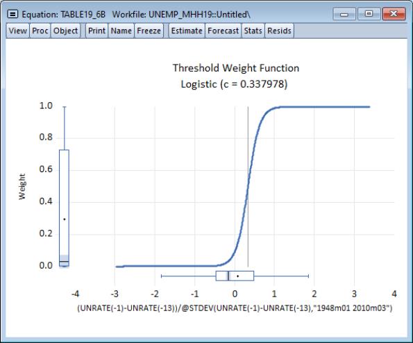 The data for unemployment consist of the U.S. Civilian Unemployment Rate (UNRATE) for persons 16 and older from 1948m01 to 2010m03 (2010-10-08 vintage). The “unemp_mhh19.wf1” workfile containing these data obtained from BLS is available in your EViews example data.