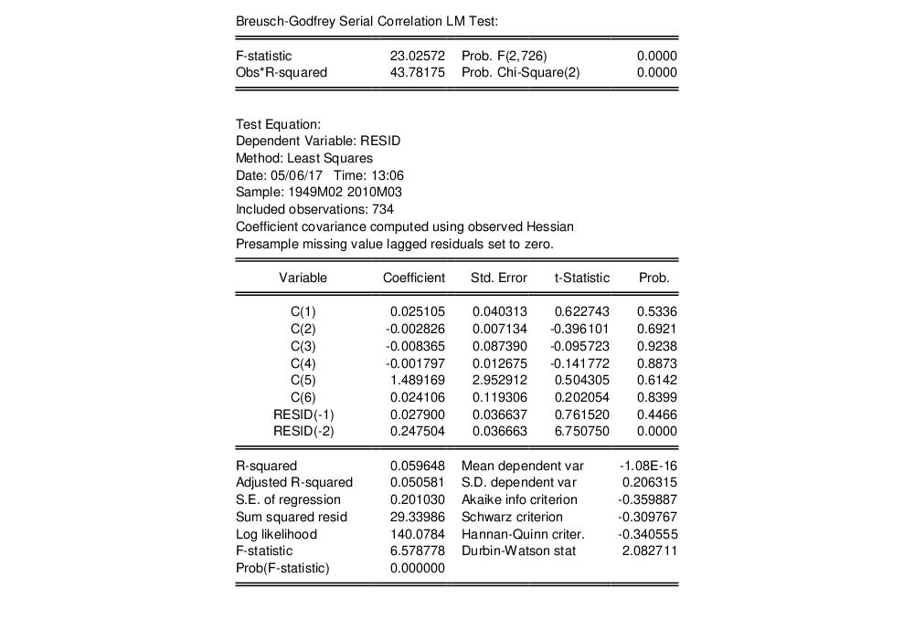 Clicking on and accepting the defaults, computes a Breusch-Godfrey serial correlation LM test using a default lag of 2: