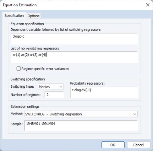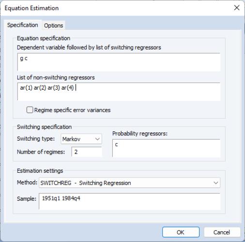 To estimate the Hamilton model, open an switching equation dialog and enter the specification as depicted below: