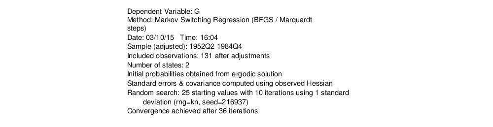 Hamilton (1989) specifies a two-state Markov switching model in which the mean growth rate of GNP is subject to regime switching, and where the errors follow a regime-invariant AR(4) process. The data for this example, which consists of the series G containing (100 times) the log difference of quarterly U.S. GNP for 1951q1–1984q4, may be found in the workfile “GNP_hamilton.WF1”.