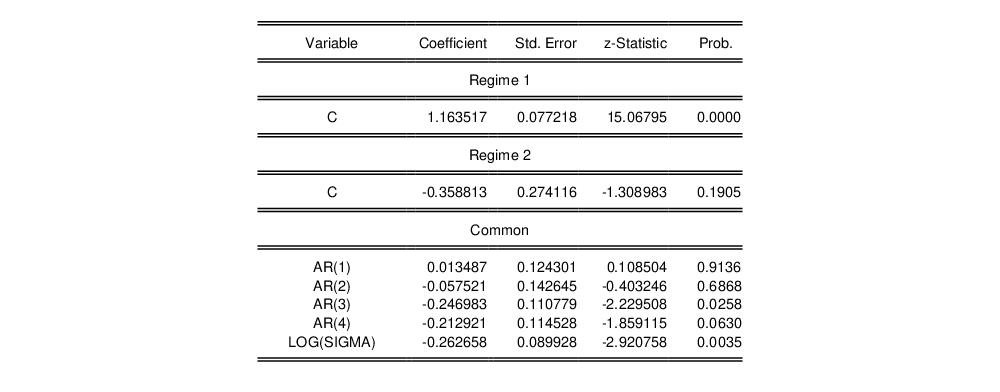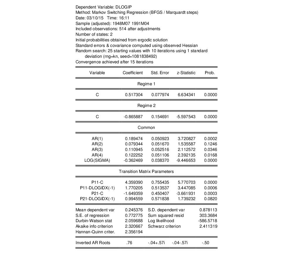 The middle section displays the coefficients for the regime specific mean and the invariant error distribution coefficients. We see, in the differences in the regime specific means, what Hamilton terms the fast and slow growth rates for the U.S. economy.