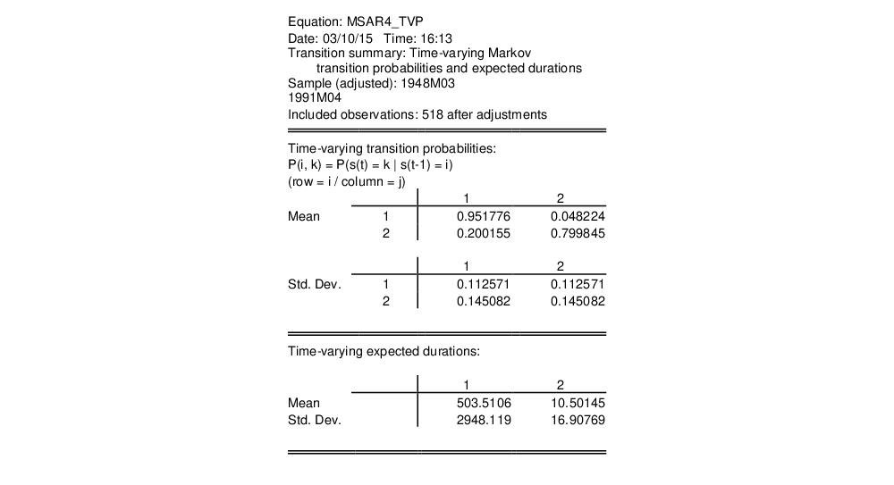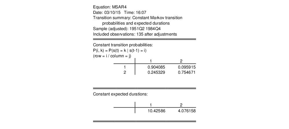 Here, we see the transition probability matrix and the expected durations. Note that there is considerable state dependence in the transition probabilities with a relatively higher probability of remaining in the origin regime (0.90 for the high output state, 0.75 for the low output state). The corresponding expected durations in a regime are approximately 10.4 and 4.1 quarters, respectively.