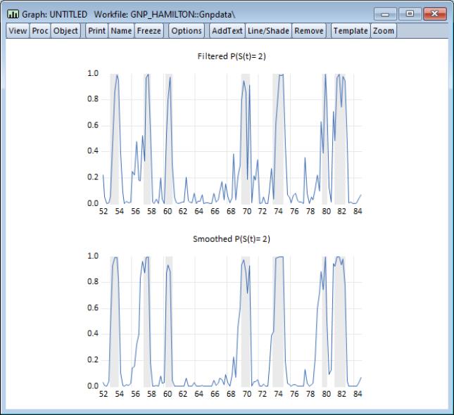 http://www.eviews.com/Addins/addins.shtml) to label the NBER recessions, we see that the predicted probabilities of being in the low output state coincide nicely with the commonly employed definition of recessions: