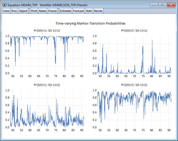 We can see the variation in the time-varying probabilities by examining graphs of the transition probabilities for each observation. Select and click on the radio button. The default view for showing the probabilities is a graph so you may simply click on to show graphs for all four probabilities.